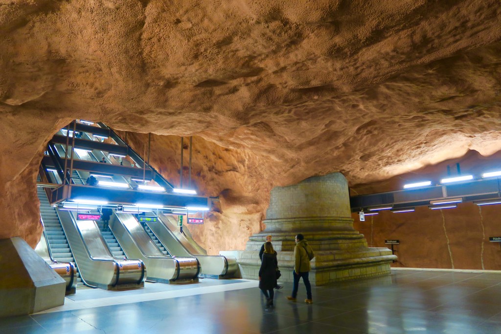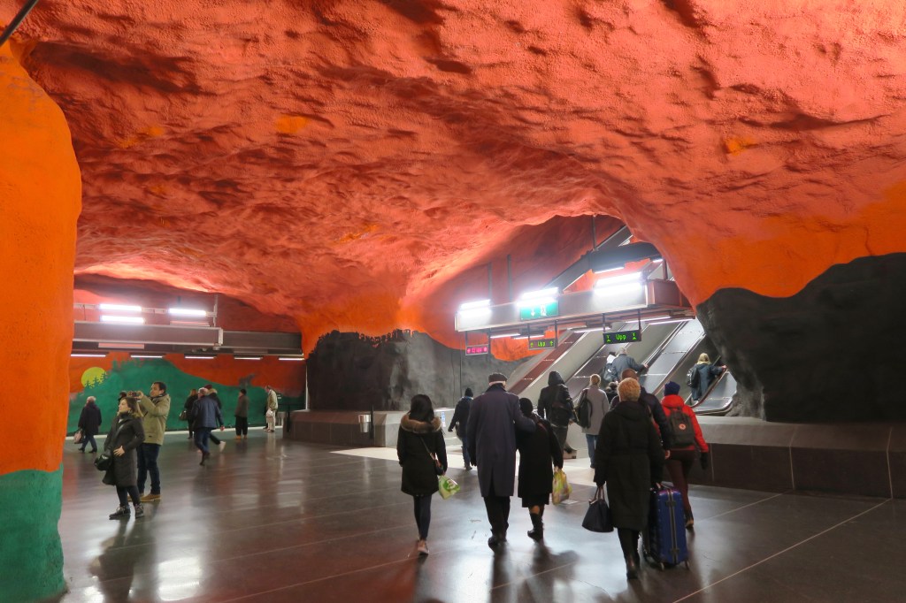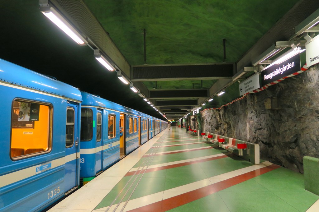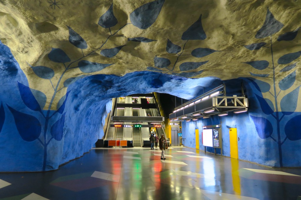 T-Centralen Station – the only station where all three of the metro’s lines meet – is notable for the painted blue leaves which decorate its exposed rock walls.