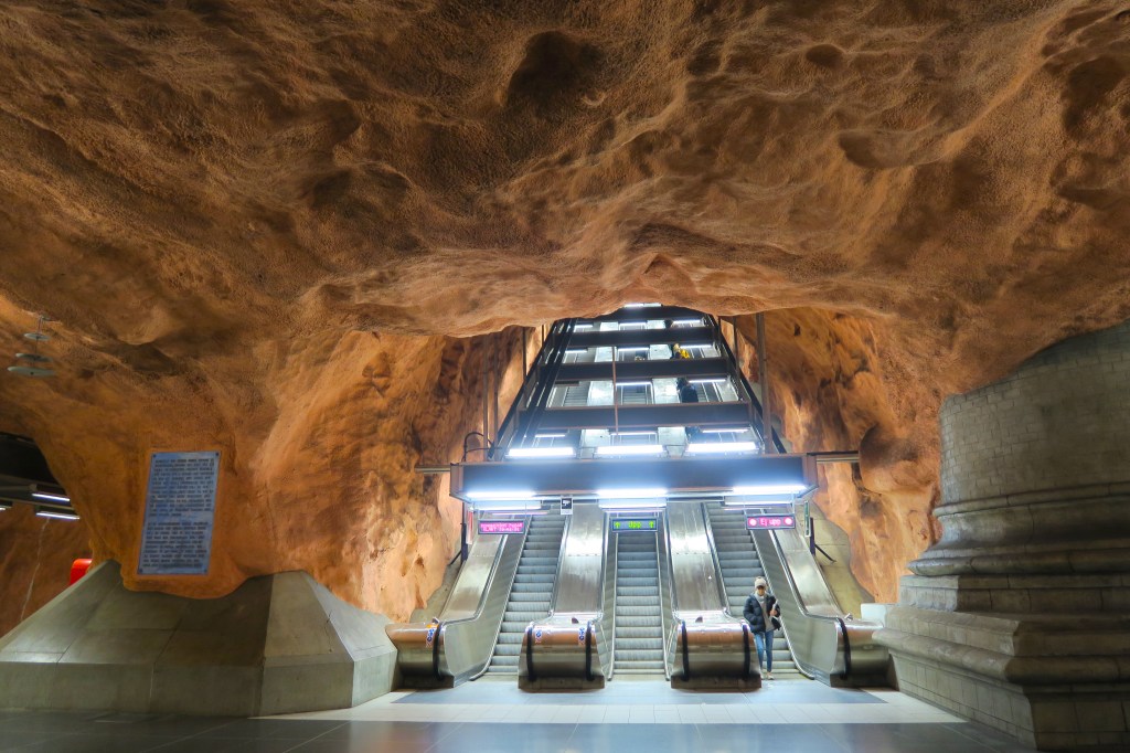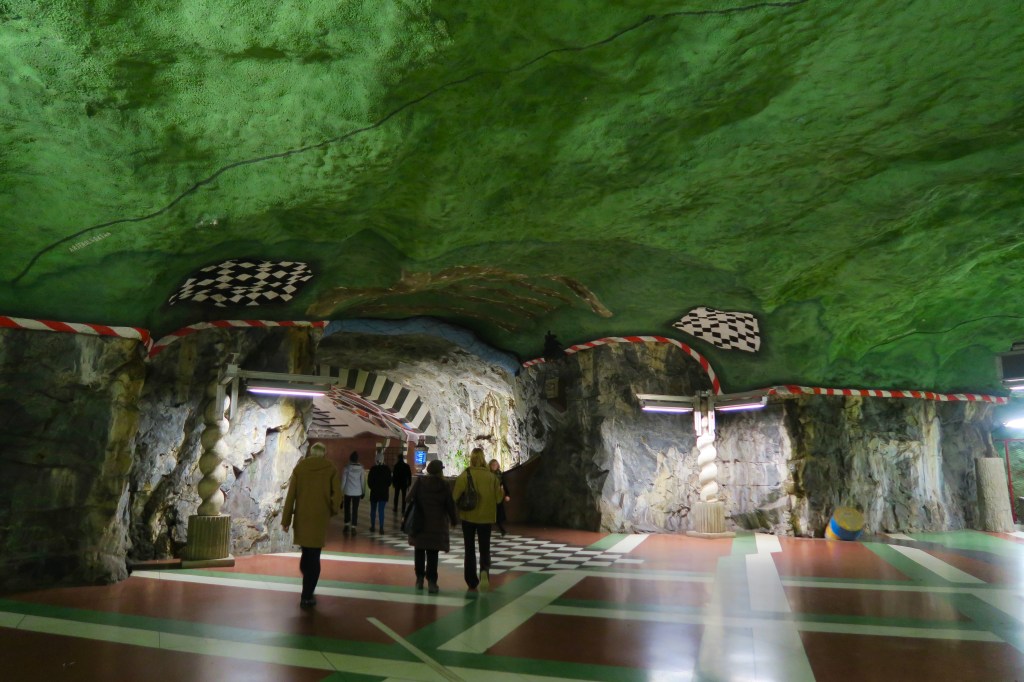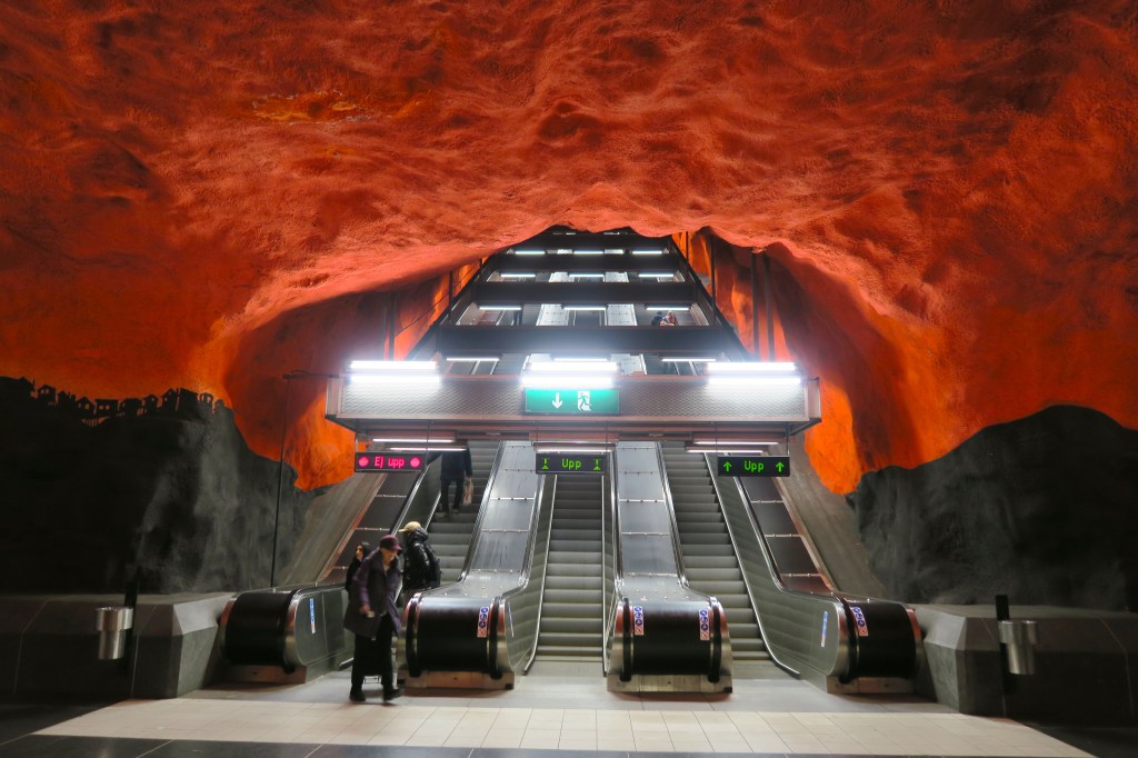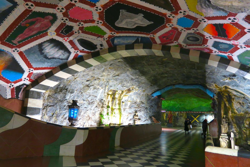 In December 2018, I spent a rainy afternoon in Stockholm exploring the city’s unique metro stations. Over 90 of the network’s 100 stations are decorated with paintings, rock formations, and installations. After purchasing a 75 minute time-based ticket, I travelled along each of the metro’s three lines, alighting whenever the train arrived at a station that looked particularly impressive.