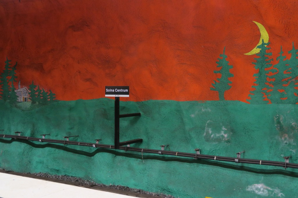 My personal favourite station, Solna Centrum, is nicknamed the “Gates to Hell” with its exposed rock walls covered in aggressive blood red and black paint. Elsewhere, splashes of green represent the forest against a backdrop of the red evening sun.