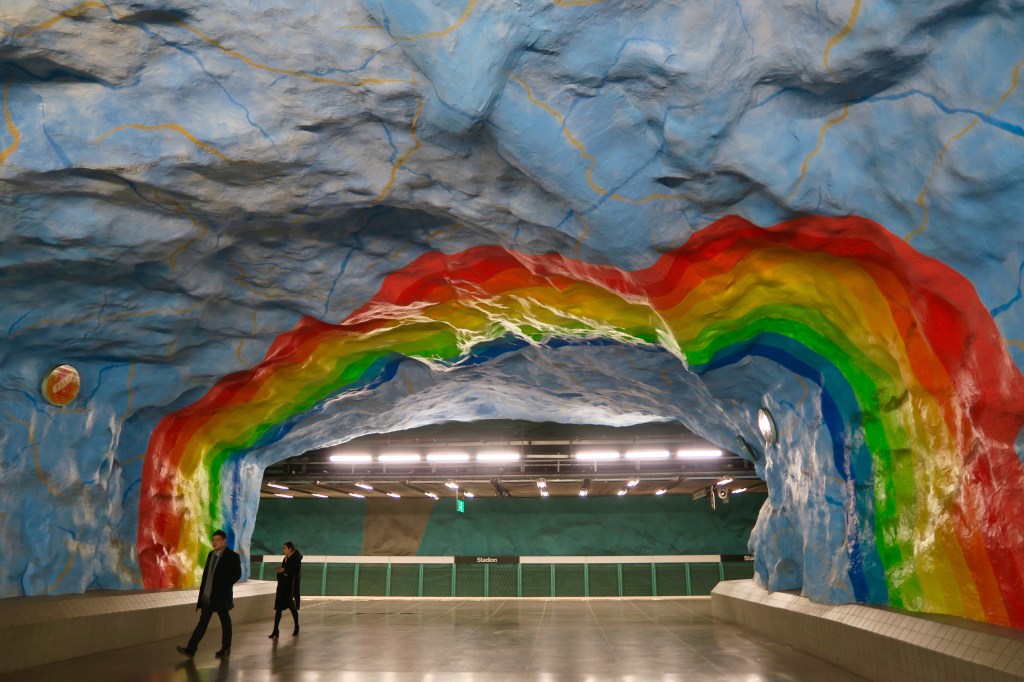 Stadion Station appeared to be one of the most popular in Stockholm’s metro system for photographers. A rainbow archway, stretching across a tunnel that links the station’s two platforms, is set against a sky blue backdrop. The rainbow’s colours are apparently a nod to the olympic rings, with Stadion Station serving the nearby Stockholm Olympic Stadium which was constructed for the 1912 Summer Olympics.1