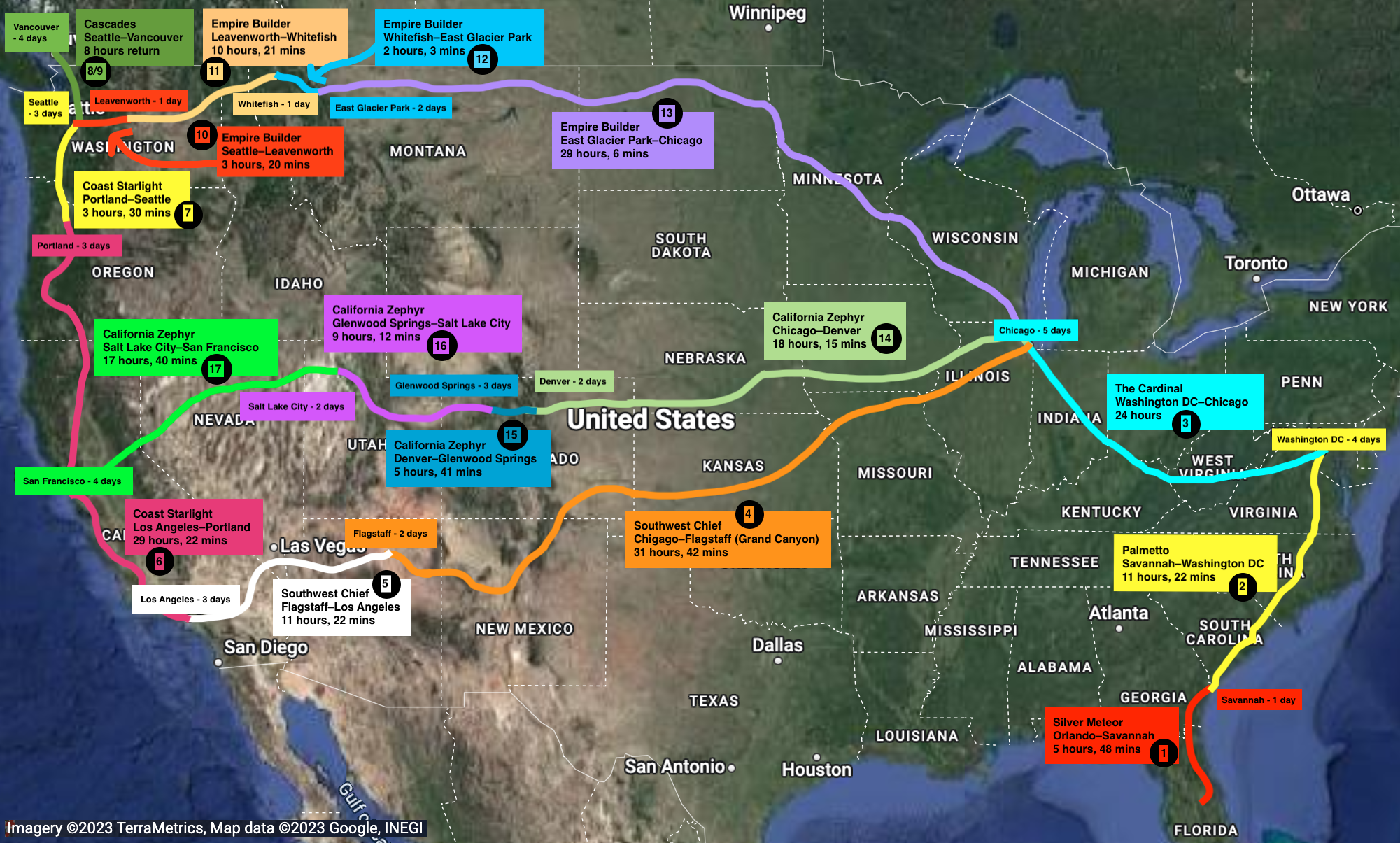 Over 59 days (July – September 2019), I will traverse 27 States, 1 Federal District, and 1 Canadian Province, with an estimated 220 hours and 44 minutes of train travel. I cover 6 of Amtrak’s long-distance routes:
