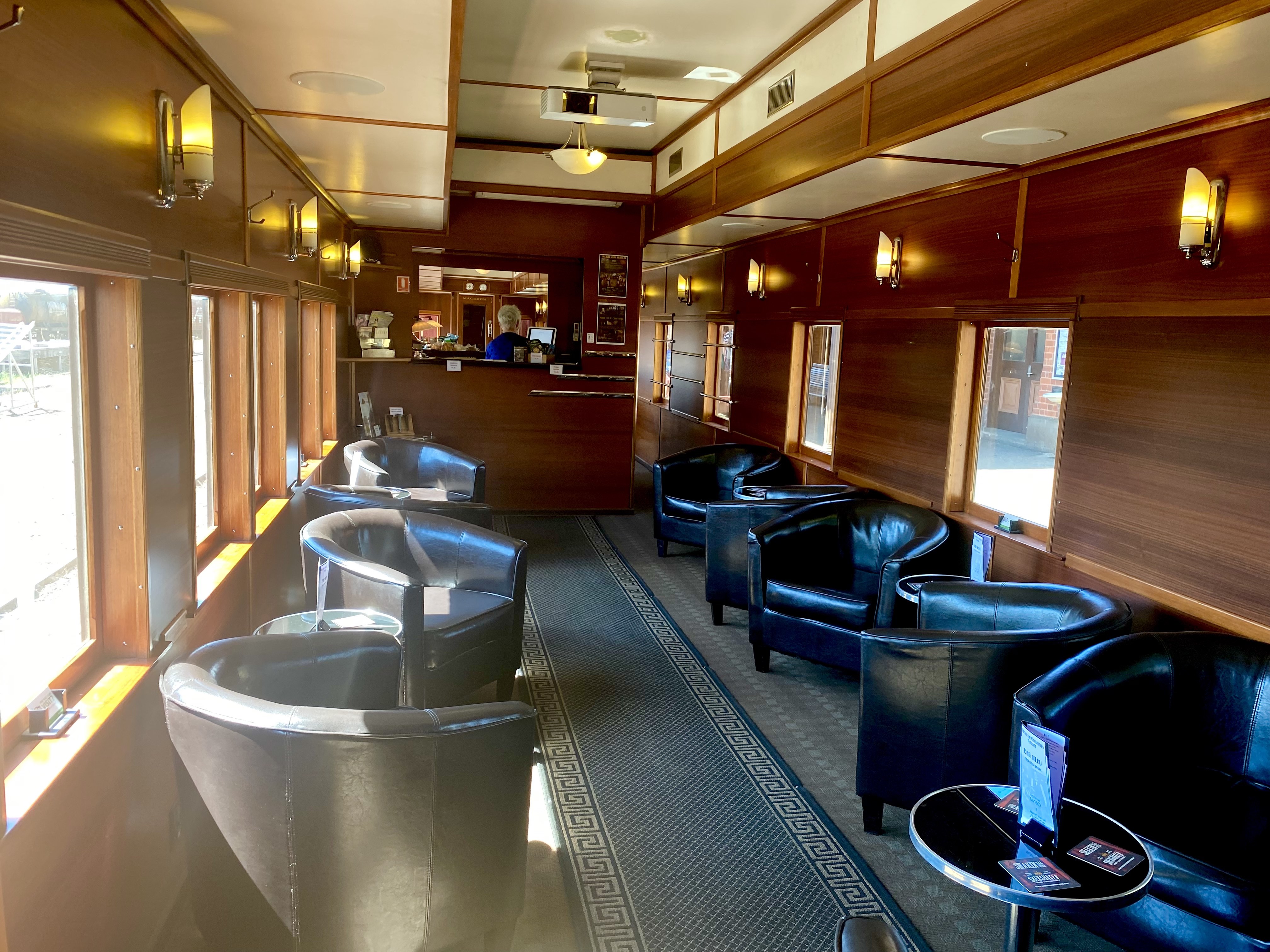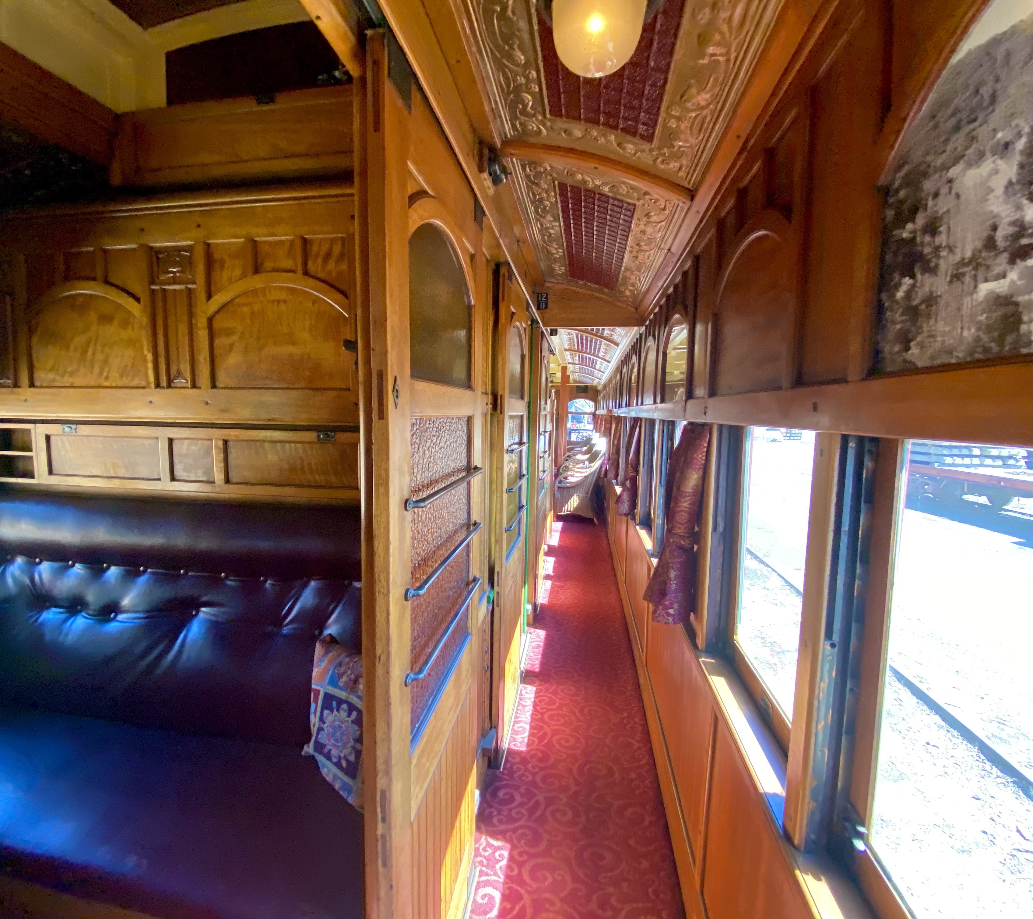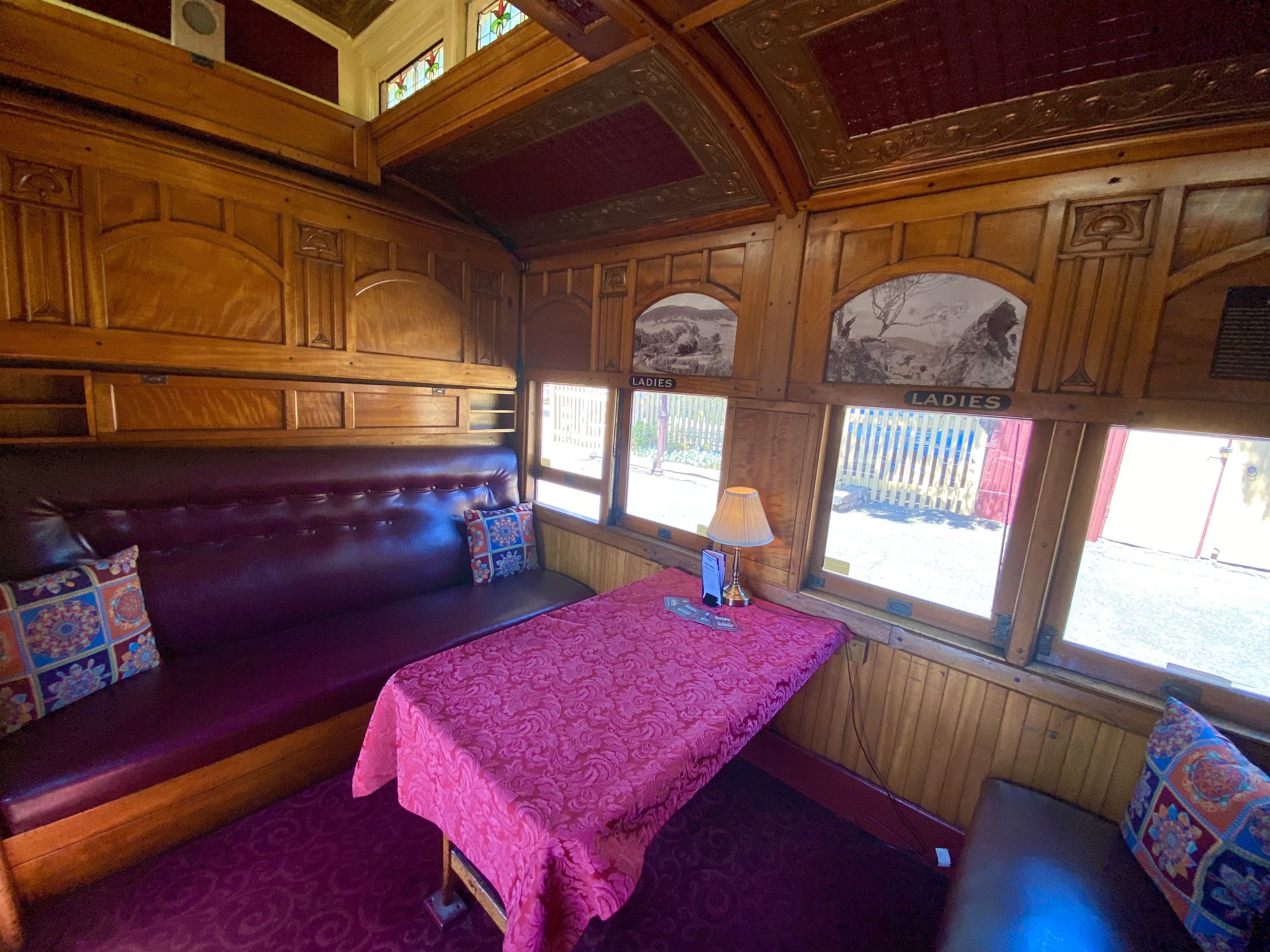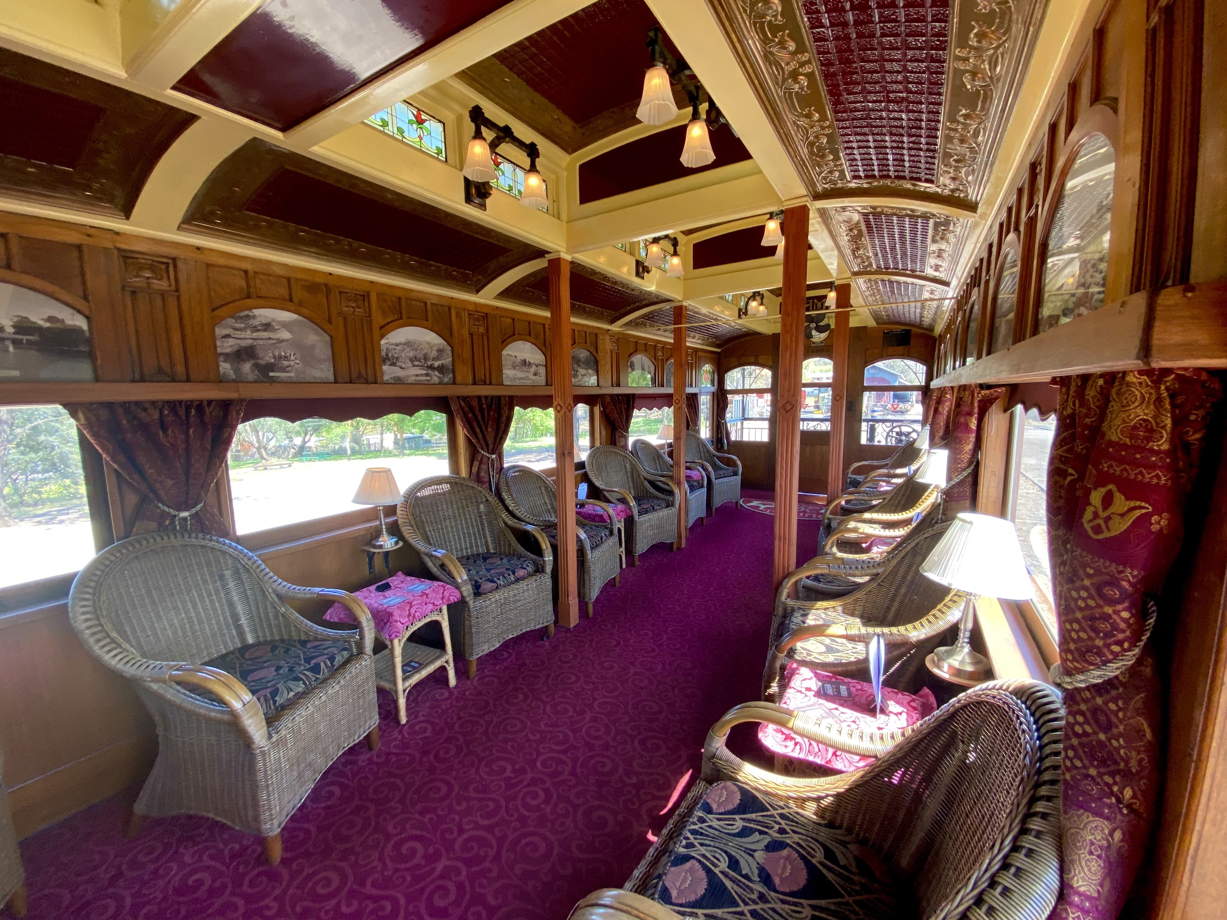 The elegant ‘Tambo’ carriage was constructed in 1919 and is described as ‘a fine example of Edwardian elegance’.[11] It features cosy individual compartments with art nouveau fittings and dècor, in addition to a large lounge area with cane chairs and a viewing platform.