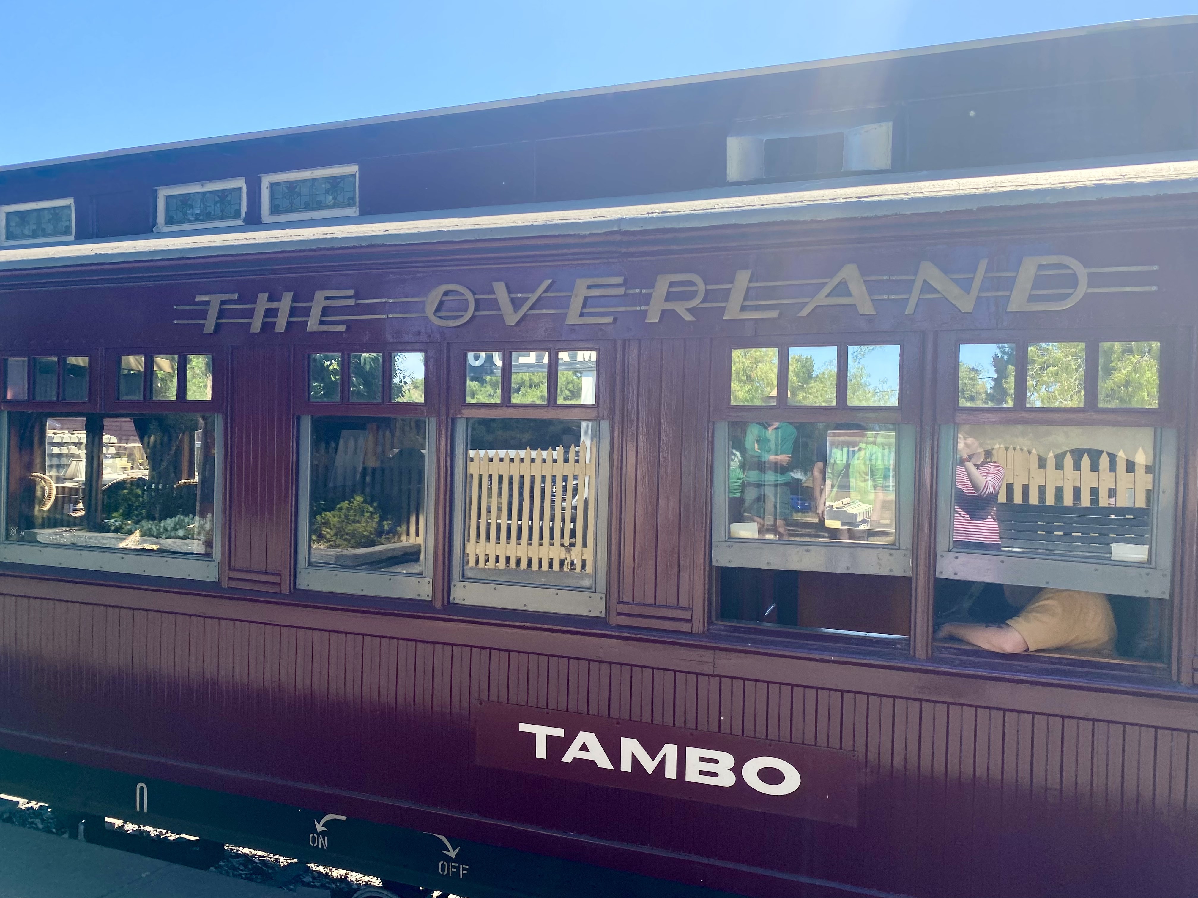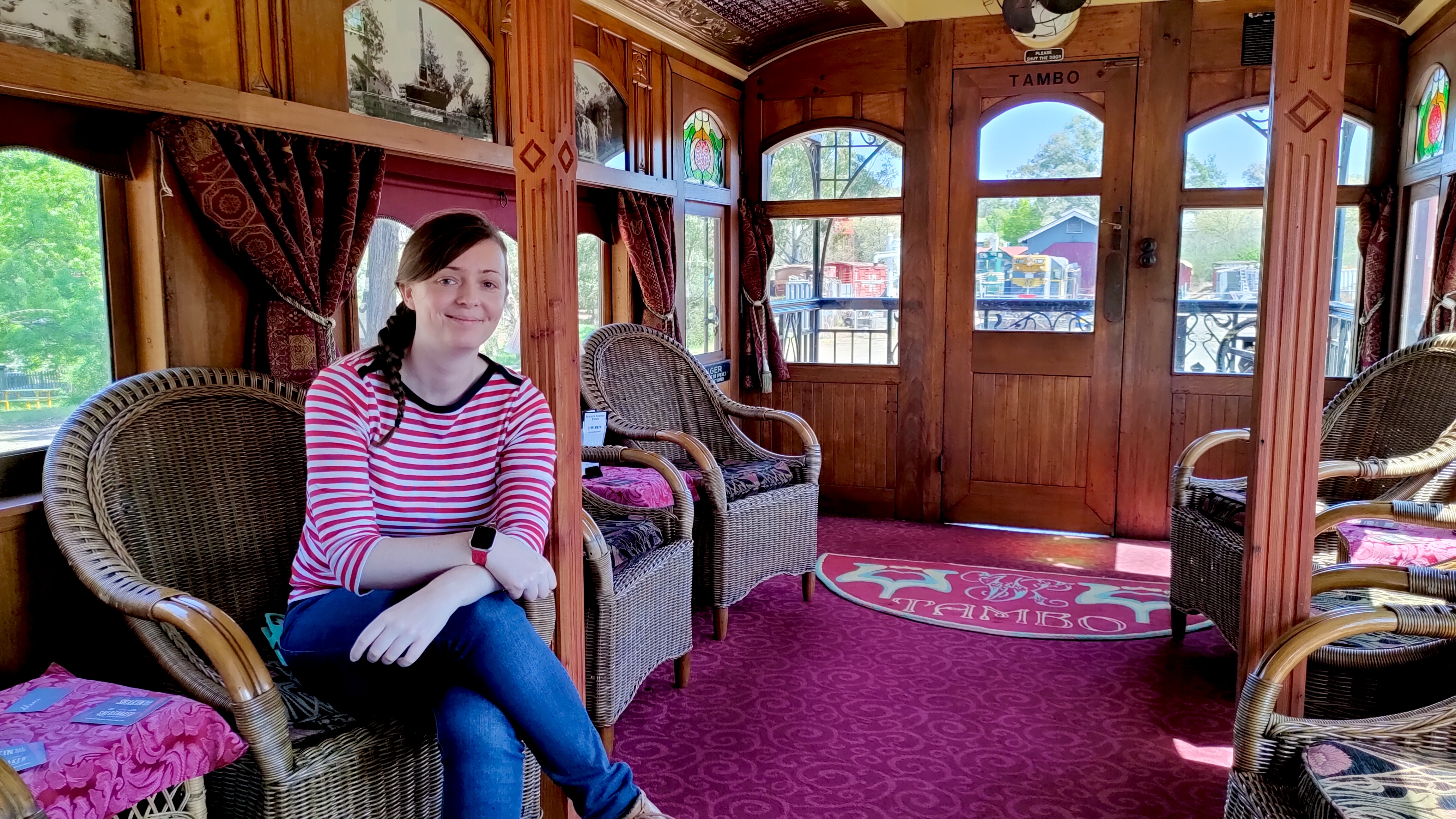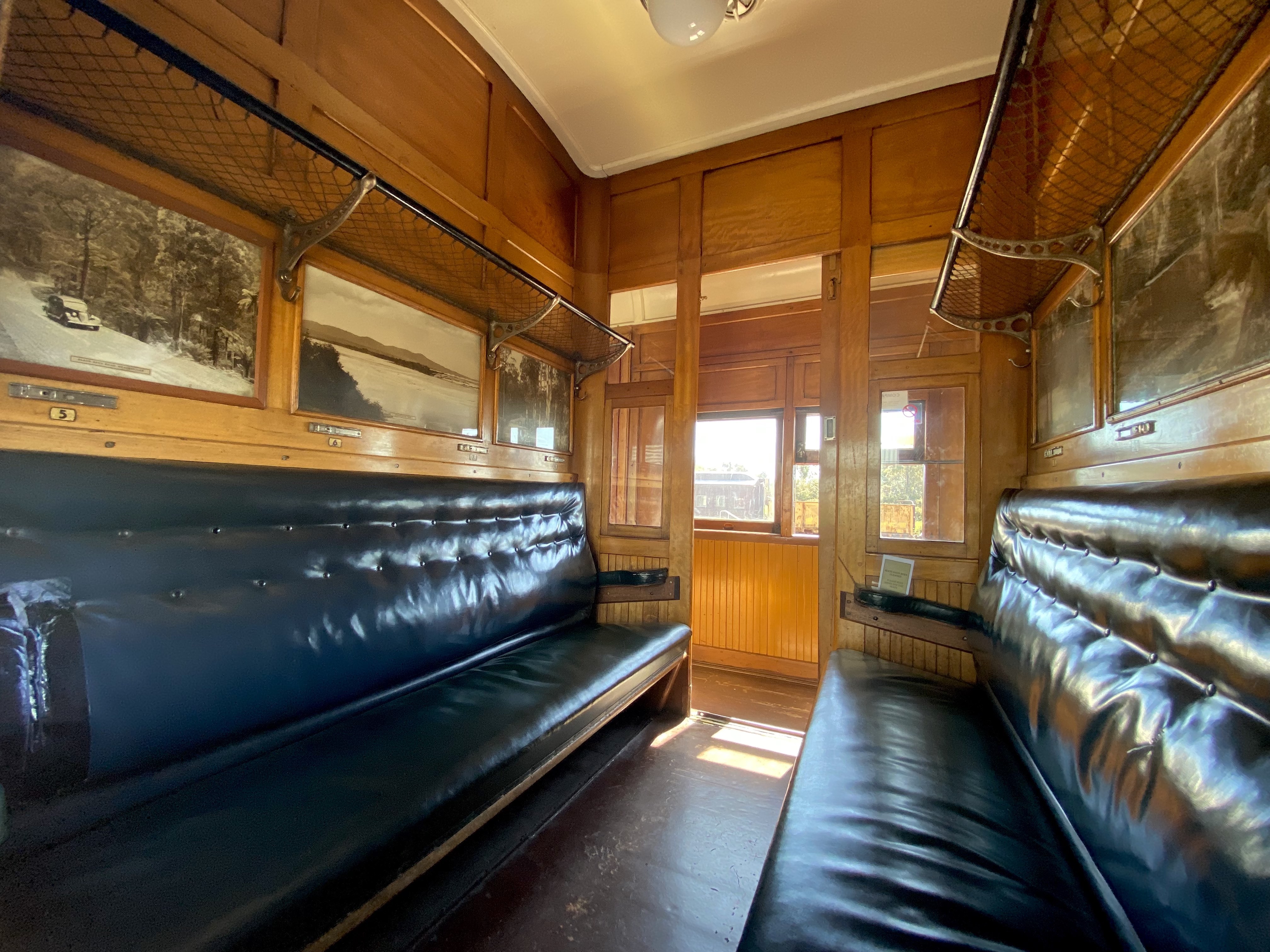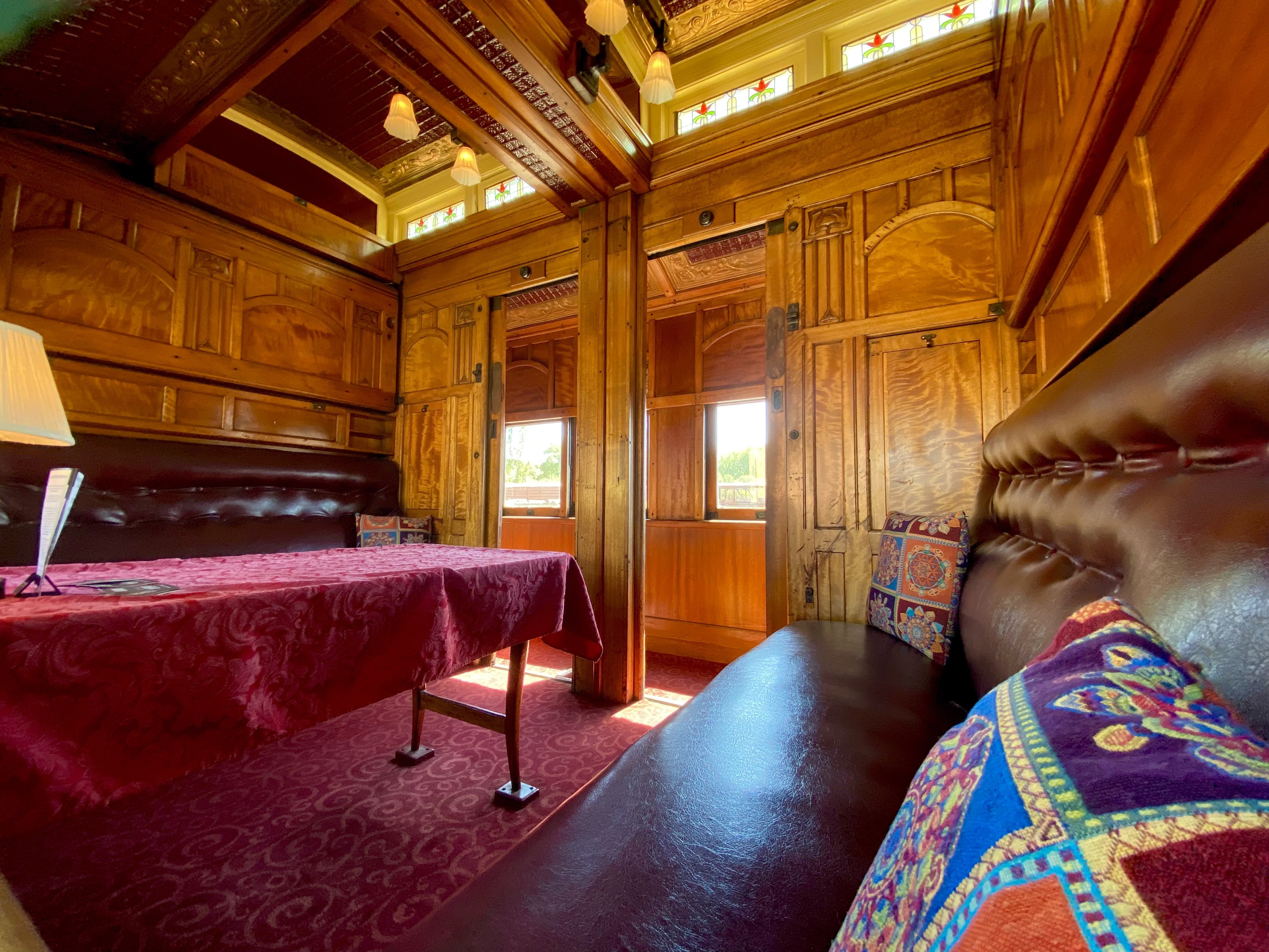 The elegant ‘Tambo’ carriage was constructed in 1919 and is described as ‘a fine example of Edwardian elegance’.[11] It features cosy individual compartments with art nouveau fittings and dècor, in addition to a large lounge area with cane chairs and a viewing platform.