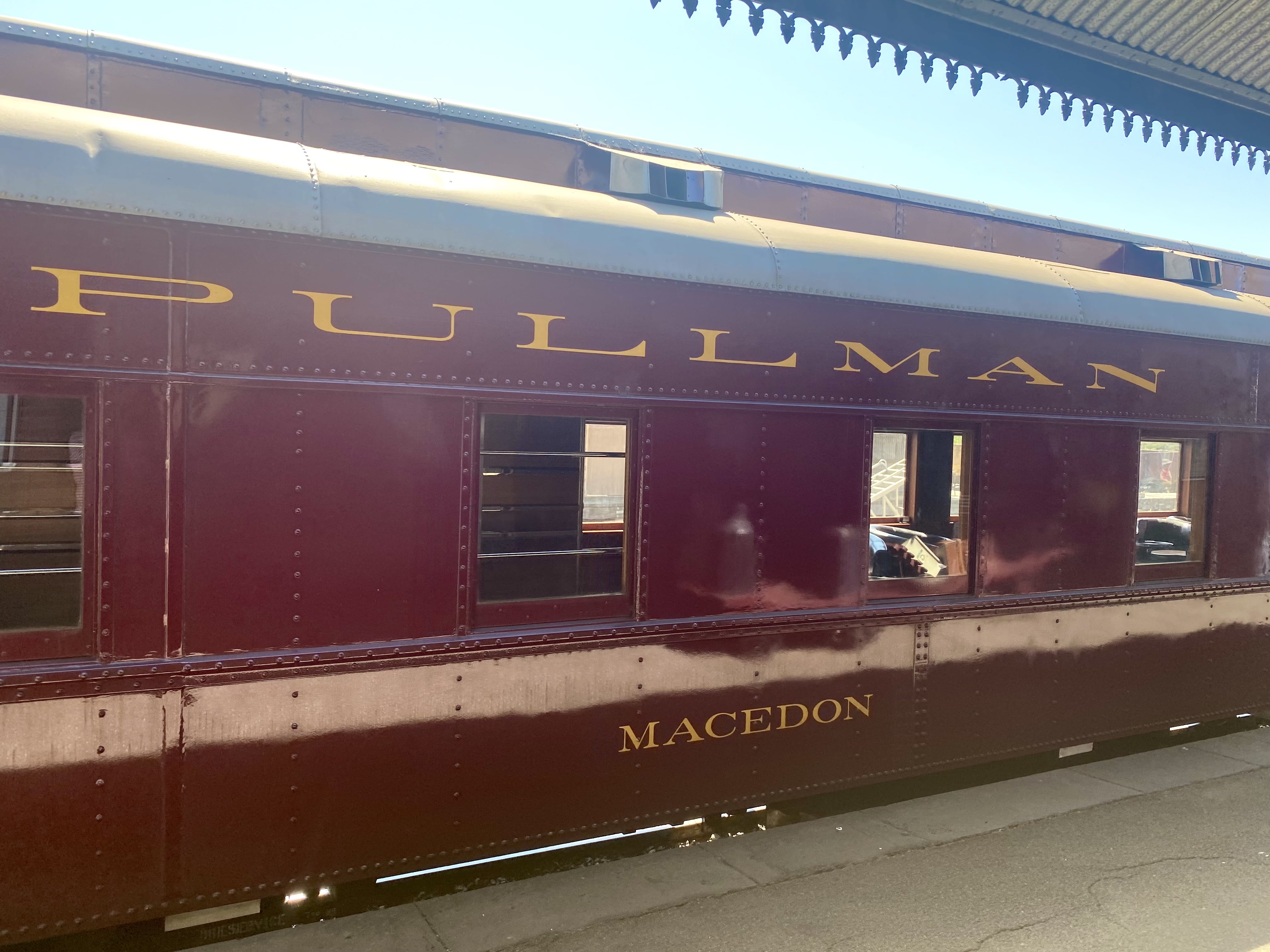 The art deco ‘Macedon’ carriage, from 1928, was constructed by the Pullman company in Chicago.[12] It consists of leather club chairs and a bar.