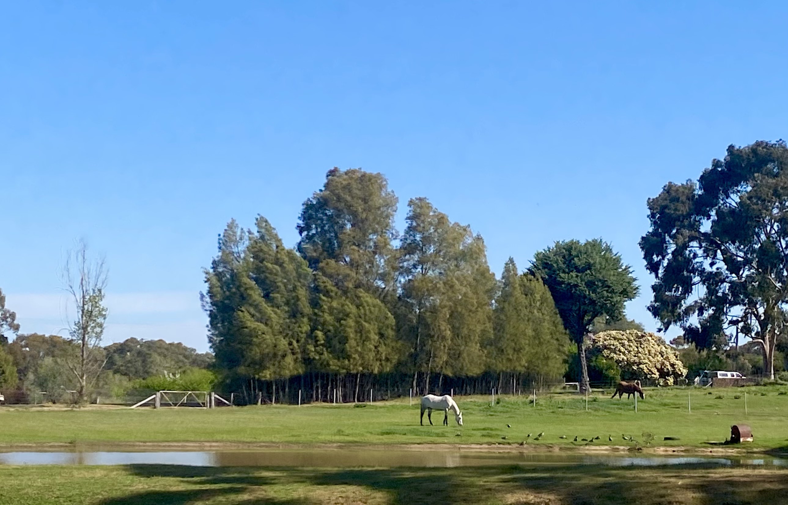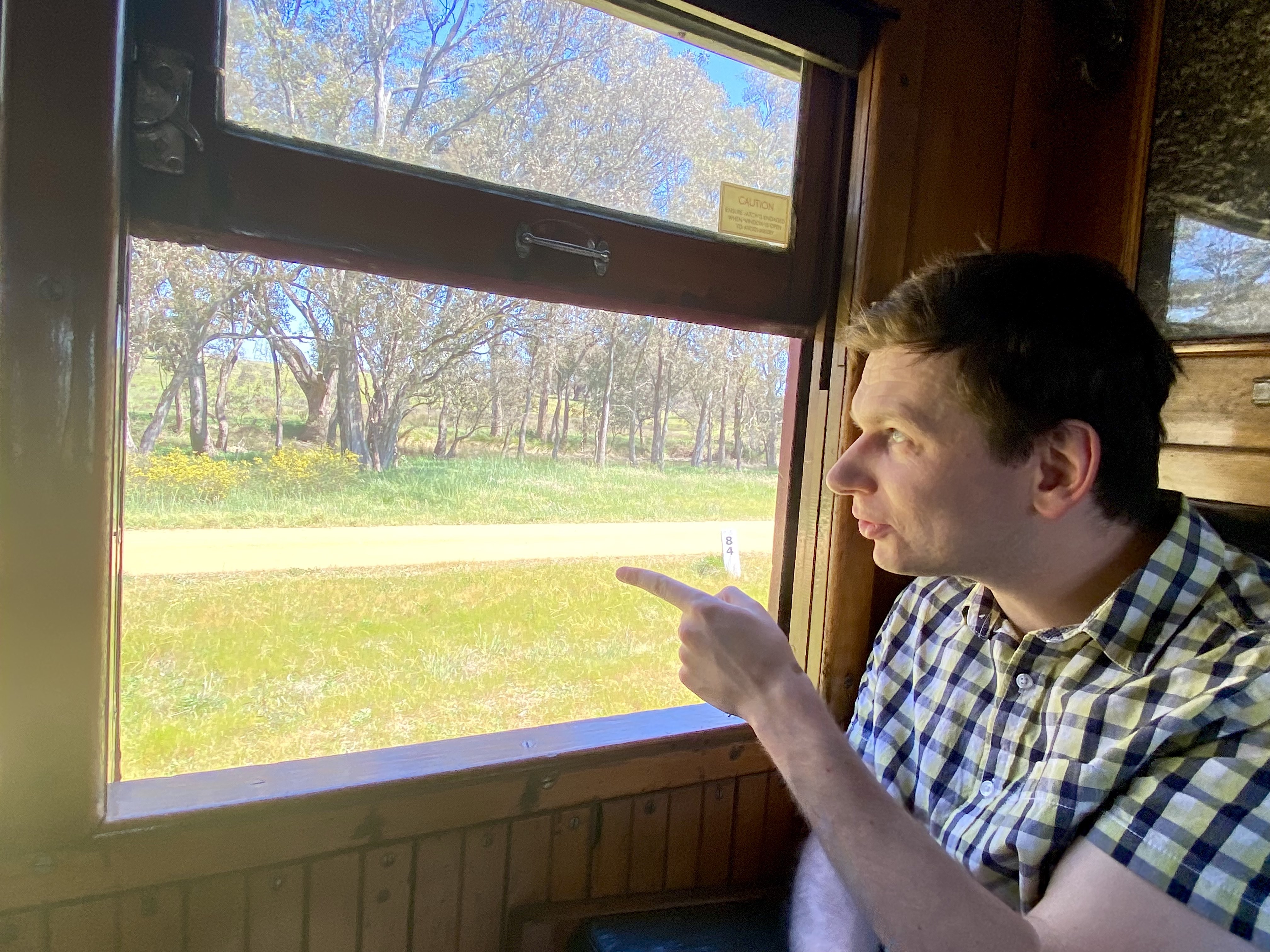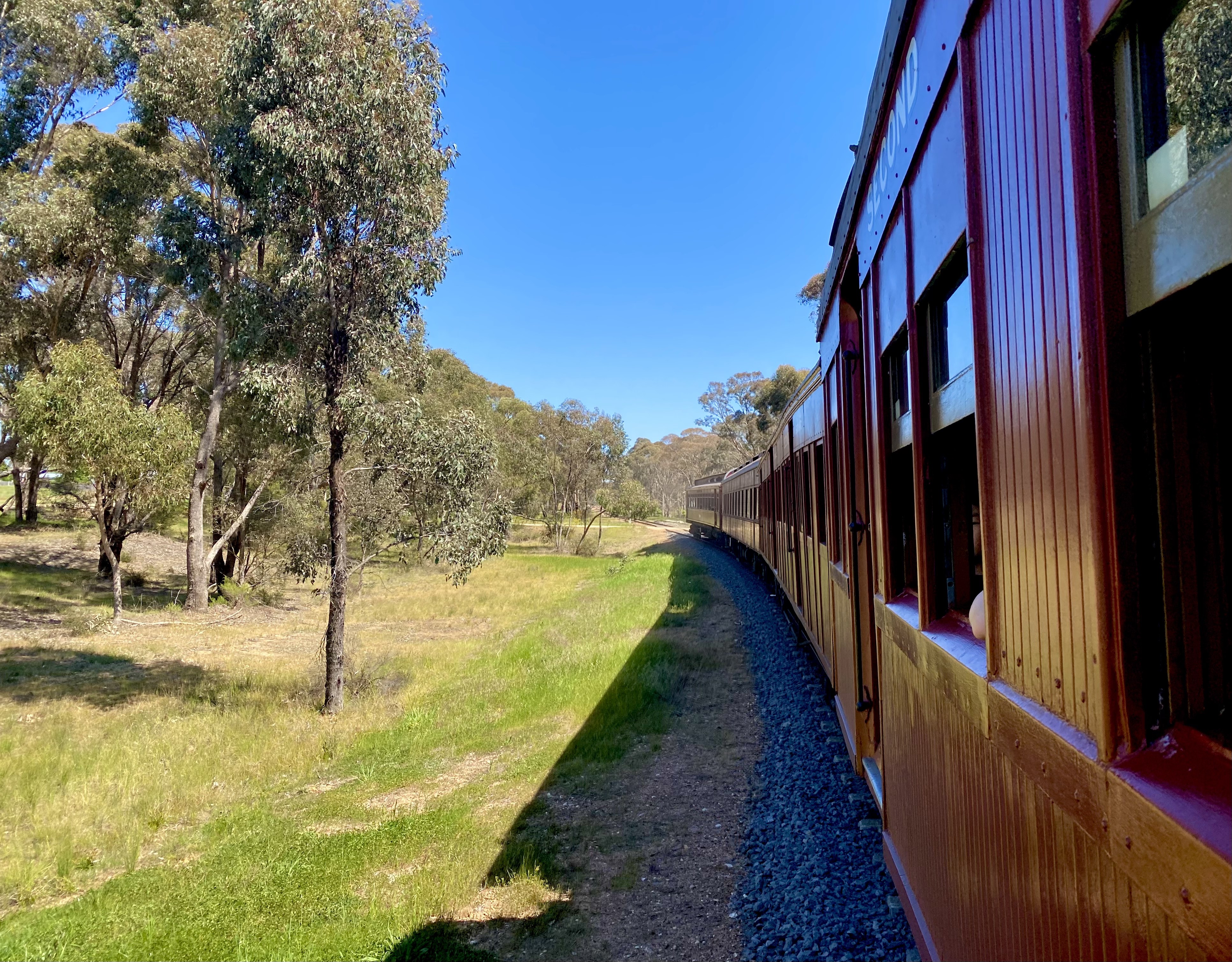 Having explored the first-class carriages, we took our seats in second-class, eagerly anticipating the journey to Castlemaine. Our train was hauled by a heritage diesel engine. The train travelled at a leisurely pace, allowing people in the houses adjacent to the tracks to emerge from their homes and wave excitedly at the passing train. A bike path also runs adjacent to the tracks the whole way between Maldon and Castlemaine, and we passed many families enjoying a leisurely weekend ride. Regrettably, the sights en route were not exactly thrilling. The scenery was largely unchanging and consisted almost entirely of farmland and open forests.